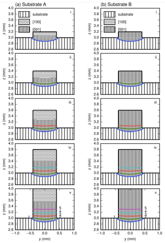For the z-step of 100 μm in substrate A, Figure 8a, in the first layer deposition, the [001] region forms in the lower part while the [100] region appear in the upper part. The [001]/[100] boundary is clear. After the second layer’s deposition, due to the small z-step, the whole [100] and partial [001] regions of the first layer are remelted and the new [001]/[100] boundary moves upward. When five-layer depositions are carried out successively, no [100] region exists within the first four layer traces in the lower main cladding part. This agrees well with the experimental result given in Figure 5a. When the z-step increases to 300 μm (Figure 9a), the bottom trace of the second layer cannot penetrate into the [001] region in the first layer; thus, the [001]/[100] boundary of the first layer is not eliminated. The situation is repeated after the third deposition proceeds. As for substrate B, for each deposition layer under the different z-steps, the [001] dendrite region grows and extends to the sample’s top; therefore, only the [001] region produces without any SGs no matter what z-steps are selected, as Figure 8b and Figure 9b show.
