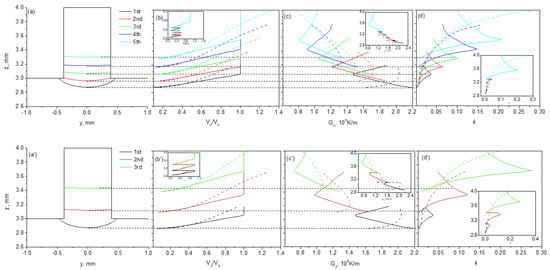 Based on the calculated temperature fields, the normalized growth velocity Vd/V, and the thermal gradient Gd, the average volume fraction of stray grain ϕ along the dendrite-preferred growth directions in the deposited part can be determined. The calculated results are given as functions of center position in the transverse section of the laser metal deposition traces for 100 and 300 μm layer steps in Figure 10, in which solid lines denote substrate A and dashed lines denote substrate B.