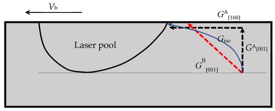 For the z-step of 100 μm in substrate A, with the increase in the z position from the bottom trace in each deposition, the normalized growth velocity of the dendrite increases firstly and is then kept at 1 from the [001]/[100] boundary, at which the [001] dendrite transitions to the [100] dendrite and the growth velocity along the [100] direction is the same as the laser scanning velocity. Correspondingly, Gd decreases initially and then increases with the height, and a turn appears at the [001]/[100] boundary. Since ϕ is characterized by , it increases then decreases along the z axis in the layer if the next deposition is not performed, as shown in Figure 10d. ϕ has a maximum value at the [001]/[100] boundary where the stray grains have a higher probability of forming. It is obvious from the figure that this is because there is a minimum temperature gradient and a maximum dendrite growth velocity. With the successive depositions in this case, because of the small z-step, the [001]/[100] boundary of the previous layer is remelted by the next layer, except that of the fifth one. Vd/V, Gd, and ϕ cannot reach their maximum or minimum values in the previous layer then return to the values of the next one, as the insets are given. For the z-step of 100 μm in substrate B, however, the situations are different from those of substrate A, as the dashed lines given in Figure 10a show. In this case, because only the dendrite with the preferred growth direction of [001] exists, the growth velocity of the dendrite increases monotonously. For the thermal gradient along the preferred growth direction, it increases firstly and then decreases, which is quite different from the case in substrate A. This difference is induced by the 45° deviation between the two preferred [001] directions in substrate A and substrate B, and is illustrated in in Figure 11. The isothermal gradient Giso is perpendicular to the isothermal lines during laser treatment, and it changes direction and decreases continuously. In substrate A, the direction of Giso deviates from that of GA [001] from the layer’s bottom in the [001] region, and then it approaches that of GA [100] from the [001]/[100] boundary surface in the [100] region. This leads to a “decrease-increase” tendency for GdA. In substrate B, however, since the direction of GB [001] for [001] dendrites is direct, as Figure 11 presents, first approaching and then deviating from that of Giso, it increases initially and then decreases. Because of these different characteristics of Gd in the two substrates, ϕ shows an “increase-decrease” tendency in substrate A, but increases monotonously in substrate B with z. However ϕ behaves in the two substrates, the most striking feature is that in each layer, it is much smaller in substrate B than in substrate A.