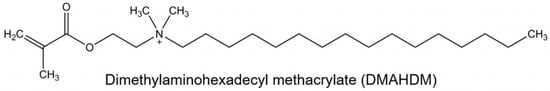 Efforts were made to enhance acrylic resins’ antimicrobial properties [26,27,28,29,30,31,32]. These attempts include microbial repelling multilayer coating [33], incorporating various metal oxide fillers and fibers [30,34,35,36], embedding spherical Ag NPs [31,37,38], addition of zinc oxide nanoparticles (ZnO NPs) [29,32], reinforcement with nanodiamonds (ND) [30], plant extracts and phyto-compounds [39], and mesoporous silica coated with cerium oxide nanoparticles [40]. Quaternary ammonium methacrylates (QAMs) are antimicrobial monomers that are stabilized to the dental resin and act as immobilized bactericides which have led to promising antimicrobial results [41,42,43,44,45,46]. They immobilize the antimicrobial components in the resin matrix by covalent bond formation, which then acts as a free bactericide [41,42,43,44,45,46]. The QAM, with an alkyl chain length of 16 units, is referred to as dimethylaminohexadecyl methacrylate (DMAHDM) (Figure 1) and it has shown strong antimicrobial potential when copolymerized with dental resins [47,48]. Dimethylaminohexadecyl methacrylate (DMAHDM) is a powerful antimicrobial agent used in dental materials, primarily due to its quaternary ammonium structure, which is responsible for its broad-spectrum antimicrobial activity. The mechanism of action of DMAHDM centers on its ability to disrupt bacterial cell membranes. The quaternary ammonium group in DMAHDM is positively charged, which allows it to interact with and penetrate the negatively charged bacterial cell membranes. This interaction destabilizes the membrane, leading to leakage of cellular contents and ultimately causing bacterial cell death. Additionally, the long alkyl chain in DMAHDM enhances its membrane-disruptive capabilities, making it particularly effective against a wide range of bacteria. Besides killing bacteria, DMAHDM also inhibits biofilm formation by preventing bacterial adhesion to surfaces, which is crucial for reducing persistent infections [41,42,43,44,45,46,47,48].