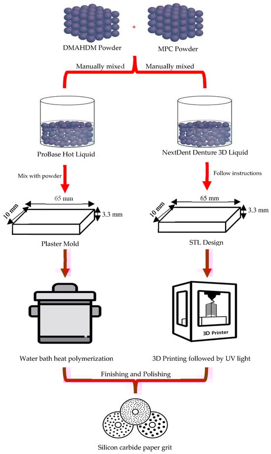 Specimens were designed as rectangular specimens measuring 65 × 10 × 3.3 mm (±0.2 mm) and saved as a standard tessellation language (STL) file, then fabricated using a 3D printing machine (DentalFab, Microlay Dental 3D Printers, Madrid, Spain) at a 45-degree angle with a supporting structure. After manually mixing the DMAHDM and/or MPC into the liquid resin, the bottles containing the liquid resin were shaken manually for 5 min and then mixed for 2.5 h using a mixer (LC-3DMixer, NextDent, Soesterberg, The Netherlands) before being poured into the resin tray as instructed by the manufacturer. The mixture was stirred in the tray for 30 s with a plastic scraper before printing. Following printing, the specimens were cleaned with 90% isopropyl alcohol for 5 min and polymerized from all sides for 30 min using ultraviolet light (385 nm) with a UV-A type 3 post-polymerization lightbox (LC3DPrint Box NextDent, Soesterberg, The Netherlands). Specimens were then finished using silicon carbide paper grit P1200 (Paper SiC P1200; Struers GmbH, Ballerup, Denmark), according to ISO 20795-1 [61] (Figure 2). Final dimensions were measured and confirmed using a digital caliper. After finishing, all specimens were stored for 24 h in 37 °C water before testing [61]. The specimens were divided into six groups, with ten specimens in each group, as described below (N = 60):