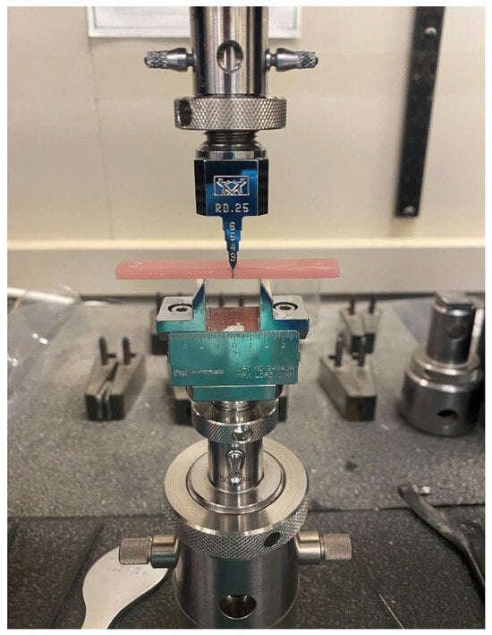 A 3-point bend test was performed by a universal testing machine (5965 Universal Testing System, INSTRON, Norwood, MA, USA), after calibration of the machine according to the manufacturer’s instructions, it was set to a 15 mm span at a crosshead speed of 1 mm/min. The specimen’s midsection was marked by a black marker to help orient the specimen to the machine. Then, it was fixed on the machine (Figure 4), and the flexural strength readings were obtained when the load was conducted to the specimen until visual failure (fracture) was reached and the flexural strength was then calculated using the following formula: