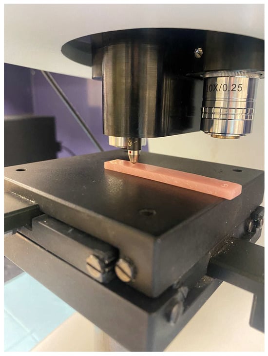A Vickers hardness testing device (Duramin-5; Struers, Ballerup, Denmark) was calibrated according to the manufacturer’s instructions and was used to perform the surface microhardness test on randomly selected regions of the specimens at a force of 1.96 N for 15 s. An indentation was created with a square-based pyramid diamond indenter (Figure 5). The diagonals of the pyramid impressed on the specimen were measured on a microscopic scale by the eyepiece operator of the testing machine, and then the surface microhardness (VHN) was calculated using the following formula: