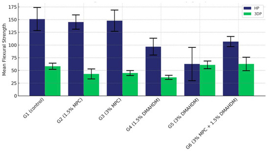The incorporation of DMAHDM and/or MPC into denture base resin materials influenced the flexural strength of both the HP and 3DP materials. The control groups for both heat-polymerized (HP) and 3D-printed (3DP) materials generally exhibited higher flexural strength compared to the other study groups. For the HP materials, the control group exhibited higher flexural strength compared to the groups with 1.5% DMAHDM, 3% DMAHDM, and the combination of 1.5% DMAHDM and 3% MPC. This is consistent with the findings of previous studies that indicated a decrease in the flexural strength of heat-polymerized denture base materials with the addition of DMAHDM, attributed to potential plasticization effects and interference with the polymer matrix integrity [53,54,60,64,65]. Moreover, those studies emphasized the effect of such additives on the reduction of candidal adhesion with varying effects on flexural strength, suggesting that the incorporation of such additives should be made with caution and that further research is needed to optimize the optimum concentration. Authors should discuss the results and how they can be interpreted from the perspective of previous studies and the working hypotheses. The findings and their implications should be discussed in the broadest context possible. Future research directions may also be highlighted.