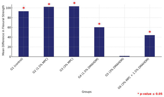 The comparison of the mean flexural strength values among the six study groups of the two materials (G1 (control), G2 (1.5% MPC), G3 (3% MPC), G4 (1.5% DMAHDM), G5 (3% DMAHDM), and G6 (1.5% DMAHDM + 3% MPC)) are presented in Figure 6 and Table 2. The one-way analysis of variance test shows a highly statistically significant difference in the mean flexural strength values among the six study groups (p < 0.0001).