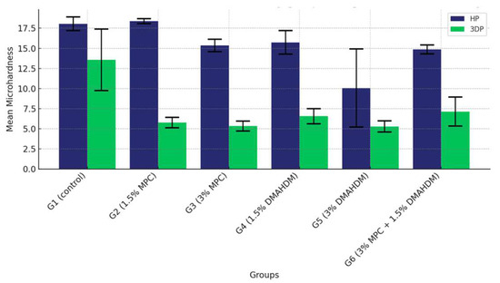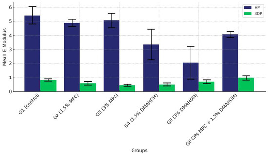 Similarly, the modulus of elasticity was affected by the incorporation of DMAHDM and/or MPC. The control groups maintained higher modulus values, suggesting that the addition of these agents may compromise the rigidity of the material. This indicates that the addition of DMAHDM and/or MPC reduces the rigidity of both HP and 3DP resins, with a more pronounced effect observed in the latter. This observation is consistent with previous studies, which found that adding DMAHDM and/or MPC to denture base materials often reduces their modulus of elasticity due to alterations in the polymer matrix structure [53,64,71].