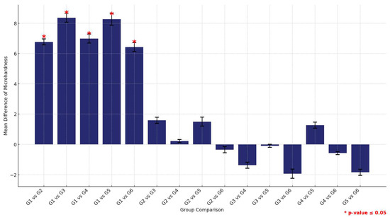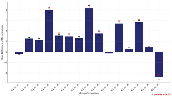 Comparison of mean flexural strength differences between the six study groups between the two tested materials. Displaying significant differences among all groups except G5. Significant comparisons are marked with a red star (* = p = value ≤ 0.05).