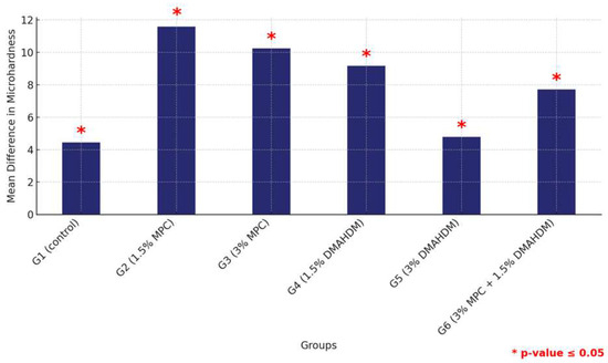 The comparison of the mean surface hardness values among the six study groups of the two study materials (G1 (control), G2 (1.5% MPC), G3 (3% MPC), G4 (1.5% DMAHDM), G5 (3% DMAHDM), and G6 (1.5% DMAHDM + 3% MPC)) is given in Figure 10 and Table 10. The one-way analysis of variance shows a highly statistically significant difference in the mean microhardness values among the six study groups (p < 0.0001).