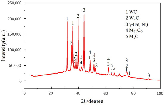 The XRD spectrum of the Ni-WC-clad layer prepared in the experiment is shown in Figure 5. Combined with the EDS elemental distribution from Figure 3 and Figure 4, it is evident that the composite coating is primarily composed of γ-(Fe, Ni), WC, W2C, M23C6, and M6C phases. The base phase is γ-(Fe, Ni), with the reinforcing phases mainly consisting of WC, W2C, and various carbides. Additionally, the (Fe, Ni) solid solution supports these hard phases.