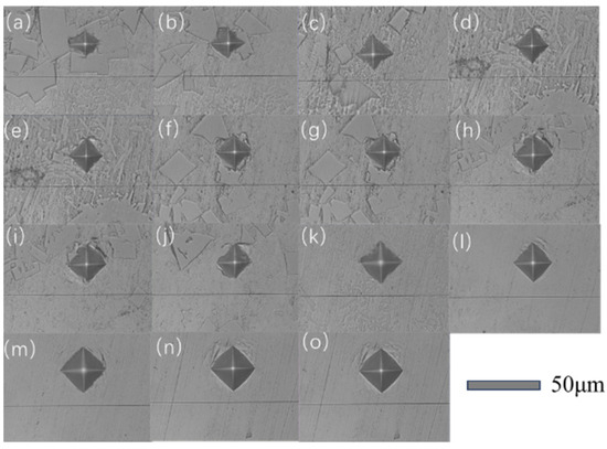 Microhardness indentations at different depths of the composite coating cross-section. (a–o) is a measurement image taken every 150 μm from the top to the bottom of the coating section.