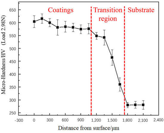 The microhardness indentations at different depths of the composite coating cross-section are shown in Figure 6, with the test results displayed in Figure 7. The microhardness of the composite coating cross-section is mainly divided into three areas: the composite coating area, the transition area, and the substrate area. The average hardness of these areas is 569.5 HV, 498.52 HV, and 280.5 HV, respectively, with the composite coating hardness showing a 103% increase compared to the substrate. In the composite coating area, as the depth increases, the bottom hardness decreases by approximately 4.6% compared to the top. Observations from Figure 2d (the cross-sectional SEM image of the top of the coating), indicate that during processing, the top of the coating, directly affected by the laser, exhibits a large temperature gradient, leading to the formation of numerous dendrites containing many grain boundaries. This generally hinders the movement of dislocations, thereby enhancing the material’s hardness to some extent [19]. Observations of the hardness changes in the transition area reveal that the hardness decreases from 569.5 HV to 498.52 HV, but the average hardness still shows a 77.7% increase compared to the substrate. This increase is due to the coarsening of grains in the transition area under laser action, reducing the material’s hardness [25]. Overall, this leads to a characteristic where the composite coating area exhibits higher hardness at the top and lower hardness at the bottom.