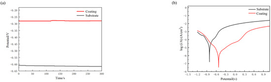 To enhance the study of composite coatings’ performance in marine environments, experiments were conducted to analyze the corrosion resistance of the coatings. The high concentration of chloride ions and complex electrochemical conditions in marine environments accelerate the corrosion process. Therefore, electrochemical corrosion tests were used to simulate these corrosive conditions, providing a rapid assessment of the coatings’ long-term corrosion resistance in actual marine environments [26]. The relationship between open circuit potential and time for samples in a 3.5% NaCl solution is shown in Figure 8a. The open circuit potential indicates the tendency for electrochemical corrosion, with lower potentials suggesting poorer corrosion resistance. The open circuit potential of the E690 high-strength steel substrate was −0.64 V vs. SCE, while the composite coating shifted positively to −0.28 V vs. SCE, an improvement of 57.6% over the substrate. This indicates a significant reduction in the corrosion tendency of the composite coating, demonstrating a marked improvement in corrosion resistance compared to the substrate.