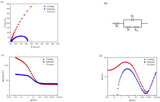 By fitting the electrochemical impedance spectra with an equivalent circuit, the corrosion resistance of the coating can be more accurately assessed. The fitting circuit used is shown in Figure 9b, where Rs represents the solution resistance, Rc denotes the resistance of the composite coating, and Rct stands for the charge transfer resistance at the interface. Figure 9c,d display the electrochemical corrosion Bode plots, which include two types of curves: the |Z|–frequency curve, where low-frequency Log|Z| corresponds to Rct (charge transfer resistance) and high-frequency Log|Z| corresponds to Rc (solution resistance); and the phase angle–frequency curve. Both impedance values for the composite coating increase, and the phase angle plateau in the mid-frequency range is broadened, indicating a continuous improvement in the corrosion resistance of the composite coating.