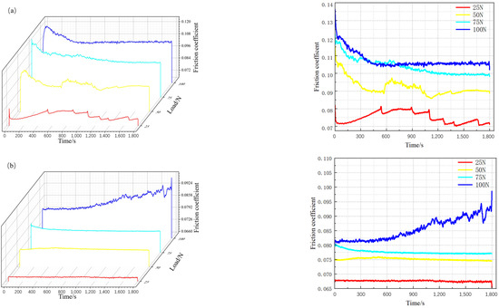 Three-dimensional and two-dimensional friction coefficient curves of the substrate and composite coating under different normal loads: (a) substrate; (b) composite coating.