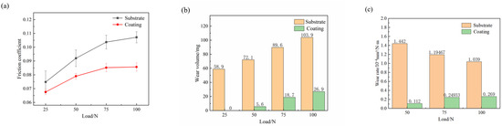Friction coefficients and wear volumes of the substrate and composite coating under different normal loads: (a) friction coefficients; (b) wear amounts; (c) wear rates.