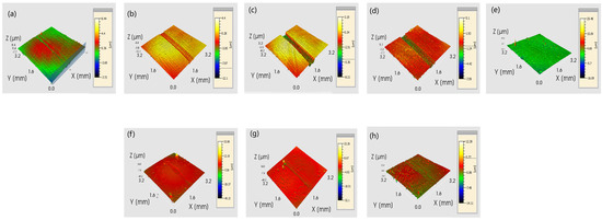Surface three-dimensional morphology of the substrate and composite coating after friction and wear under different normal loads: (a) 25 N substrate; (b) 50 N substrate; (c) 75 N substrate; (d) 100 N substrate; (e) 25 N composite coating; (f) 50 N composite coating; (g) 75 N composite coating; (h) 100 N composite coating.
