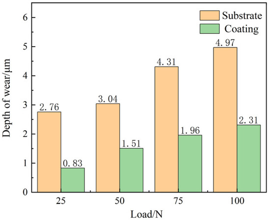 As the load increases, the wear depths of both the substrate and composite coating show an increasing trend, but under the same load conditions, the wear depth of the composite coating is significantly less than that of the substrate. This demonstrates that the prepared composite coating has higher hardness and wear resistance.