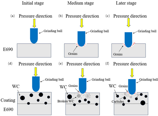 The wear mechanisms of the E690 high-strength steel and Ni60-WC composite coatings during surface manufacturing are illustrated in Figure 15. In the early stages of wear, the substrate undergoes plastic deformation under the applied load. As friction continues into the mid-stage, significant abrasive wear occurs on the substrate, resulting in the formation of grooves and the detachment of some material, which enters the frictional process. In the later stages of wear, the detached material further enters the contact interfaces, transitioning from two-body abrasive wear to three-body abrasive wear, which significantly intensifies wear. This process leads to the formation of numerous wear particles and spalling pits in some regions.