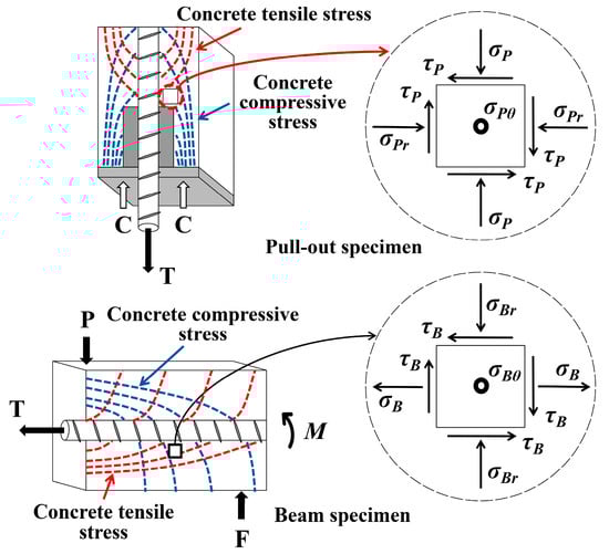 Figure 1 illustrates the stress state of the concrete surrounding the steel rebar. In the pull-out test, refers to the compressive stress that results from the pressure applied at the end of the specimen. The compression stress and the shear stress are represented by and , respectively. The represents the circumferential tensile stress that results from the compressive force exerted by a steel rebar. Only splitting cracks are observed by in the pull-out test specimens, and the bond stress distribution along the rebar is continuous. refers to the tensile stress produced during the flexure of a beam specimen during the beam test. The ring compressive stress and shear stress are represented by and , respectively. A steel rebar generates circumferential tensile stress, which is described by . Rebar stress is redistributed when a crack occurs due to flexure. During crack progression, bond pressure cannot exert enough force on concrete to cause it to split or separate. Assuming the same local bond strength and the same development length, the average bond strength of the beam test should be lower than that of the pull-out test.