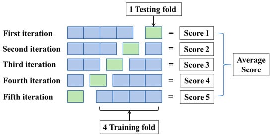 In the absence of an adequate dataset size, cross-validation can be used to avoid the overfitting problem. A cross-validation process involves dividing the original data into training and testing sets and reusing the data on each set. According to Figure 4, K = 5, which is referred to as 5-fold cross-validation. The following steps should be followed in detail: (1) Currently available data are divided into five equal subsets by random selection; (2) Four subsets of data are used for training, and the remaining subsets are used for testing the model; (3) It is recommended that this process be repeated five times with different folds for testing; (4) The average R square is used in this study as a criterion for evaluating the results of the model.