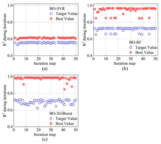 Optimizing history in model training: (a) BO-SVR; (b) BO-RF; and (c) BO-XGBoost.