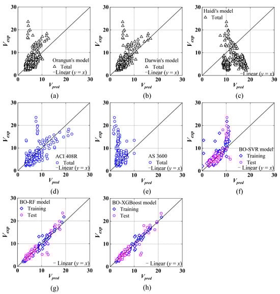Comparison of proposed bond strength models with empirical models: (a) Orangun’s model; (b) Darwin’s model; (c) Haidi’s model; (d) ACI 408R; (e) AS 3600; (f) BO-SVR; (g) BO-RF; (h) BO-XGBoost.