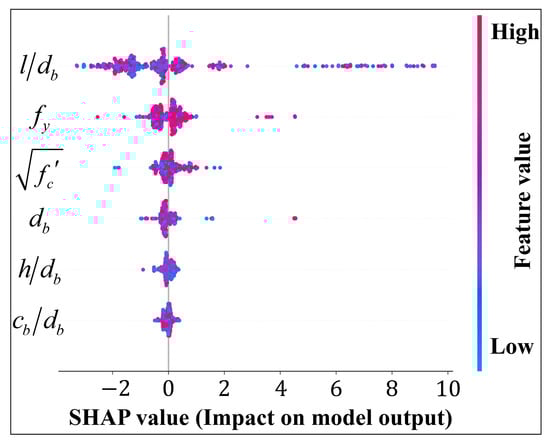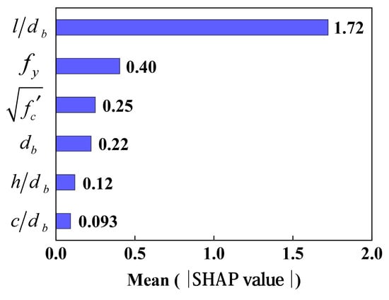 Based on the BO-XGBoost model, Figure 7 presents the mean SHAP value of the input variables used to predict bond strength and ranks them from high to low impact. According to Figure 7, () is the input variable with the highest SHAP value and is the most important component that can be used to predict bond strength. In terms of importance, () ranks second, followed by (), (), () and (). It was also noted in Refs. [20,21,24,25] that these three variables (, , ) have a significant impact on the bond strength in physical tests.
