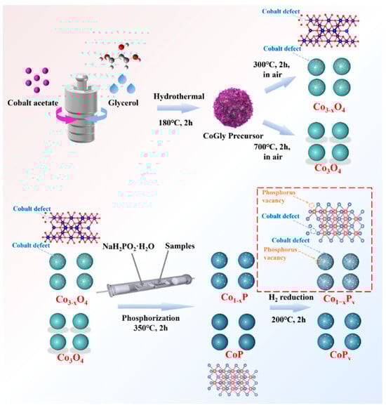 The catalysts were fabricated using a solvothermal synthesis coupled with a high-temperature phosphation process, followed by hydrogen reduction treatment, as illustrated in Figure 1. A mixture was prepared by dissolving 1.0 g of cobalt acetate tetrahydrate into 30 milliliters of glycerol, followed by 60 min of mixing using a magnetic stirrer within a 100 mL Teflon-coated autoclave. The temperature was then raised to 180 °C and sustained for a duration of 2 h. After centrifugation, the precipitates were isolated and cleaned with ethanol in triplicate. They were later dried at 60 °C for a full night. The powder was then annealed in air for 2 h at both 300 °C and 700 °C, applying a gradual heating increment of 5 °C min−1. The resulting products were named Co3−xO4 and Co3O4, respectively. The samples of Co3−xO4 and Co3O4 were subjected to a low-temperature phosphorization process at 350 °C for a duration of 2 h in an inert atmosphere, using sodium phosphomonohydrate, which resulted in the synthesis of Co1−xP and CoP. Continuing the process, the samples were further treated in a 10% H2 in Ar gas mixture (at a flow rate of 250 sccm) at 200 °C for 60 min, with a gradual temperature ramp of 2 °C min−1, culminating in the production of Co1−xPv and CoPv.