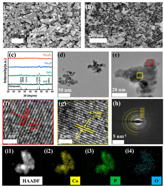 SEM images of (a) CoP (b) Co1−xPv. (c) XRD patterns of Co1−xPv, CoPv, Co1−xP, and CoP catalysts. (d) TEM image and (e–g) HRTEM images. (h) The SAED image and (i1–i4) EDX mappings of Co1−xPv.