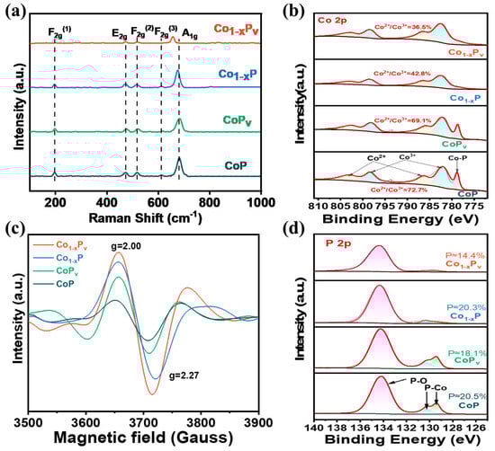 (a) Raman spectrums, (b) Co 2p XPS spectrum, (c) EPR patterns, and (d) P 2p XPS spectrum of Co1−xPv, CoPv, Co1−xP, and CoP Catalysts.