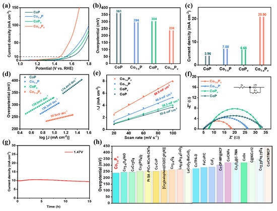 (a) The LSV, (b) the comparison of overpotential at 10 mA cm−2, (c) current density at 270 mV (d), Tafel plots, (e) current density differences plotted against scan rates, (f) Nyquist plots (g), i-t curve of catalysts in 1.0 M KOH, and (h) the comparison of overpotentials at η = 10 for Co1−xPv and reported cobalt-based catalysts.