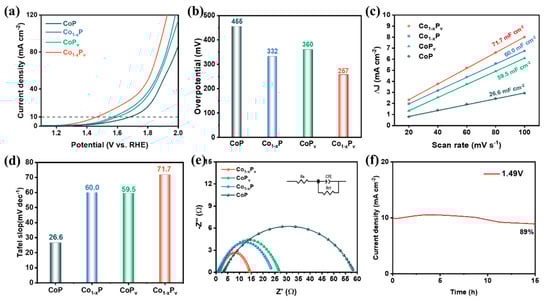 With economies and societies advancing and the reserves of conventional fossil fuels depleting, the need for sustainable energy conversion and storage technologies is growing steadily [1]. Hydrogen, generated through water electrolysis, acts as a pristine and concentrated energy source, holding promise to supplant fossil fuels in the future, thereby realizing the vision of sustainable energy development and minimizing greenhouse gas emissions [2,3,4]. Regrettably, the anodic OER is characterized by high overpotentials due to the sluggish nature of the complex four-electron transfer process. which seriously hampers the integral operational effectiveness and limits the large-scale commercialization of water electrolyzers [5]. High-priced electrocatalysts that are based on precious metals like RuO2 and IrO2 continue to be the most efficient in both acidic and alkaline environments [6]. However, the scalability of their production is hindered by the high cost of materials, the scarcity of these resources, and doubts about their durability during operational periods. Significant advancements have been made in crafting non-precious metal catalysts with robust catalytic efficacy in the past few years, encompassing various transition metal-derived materials such as nitrides, sulfides, oxides, and phosphides [7,8,9,10]. Cerium-based catalysts show great potential in OER due to their unique electronic structure and REDOX properties [11]. For example, Cerium-based metal–organic framework (MOF)-derived electrocatalysts can significantly improve their conductivity and stability and thus exhibit excellent electrocatalytic performance in OER [12]. Cobalt spinel structures, known for their adjustable cation oxidation states, abundant reactive oxygen, and economic benefits [13,14,15], include cobalt phosphide (CoP), which is emerging as a substitute for expensive platinum-group metal catalysts due to its significant REDOX properties, superior electrical conductivity, and pronounced OER performance [16,17]. Nevertheless, the efficiency of CoP catalysts is often impeded by poor electrical conductivity, suboptimal active site engagement, and restricted electron transfer, limiting its potential for commercial applications [18,19]. Therefore, finding solutions to enhance the electrocatalytic activity of CoP is essential in improving the overall performance of the OER.