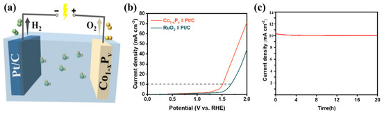(a) Diagram of the water electrolysis process, (b) polarization curves of Co1−xPv || Pt/C and RuO2 || Pt/C in 1.0 M KOH, (c) the i-t curve of Co1−xPv || Pt/C EWS.