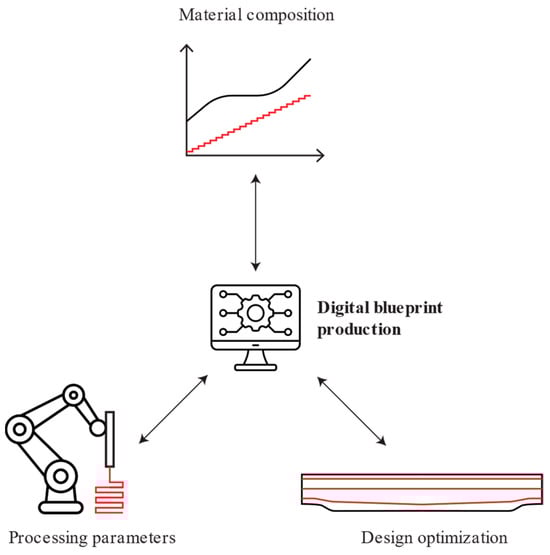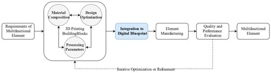 The objective of the present study is to explore the potential of such a holistic approach by developing and applying design tools at the levels of material, manufacturing, and performance design and integrating them to enable the creation of multi-functional components. The specific variables studied to facilitate this holistic approach— material composition, printing parameters, and design optimization—are described in detail in Section 2.