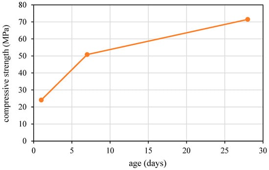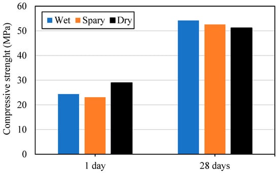 For these compositions of mixes, there was no practical influence of the curing regime on the strength achieved at various ages, as shown in Figure 12. This might be explained by the relatively low w/c ratio, where even minimal hydration is sufficient to seal the mix and keep the water inside available for continued hydration.