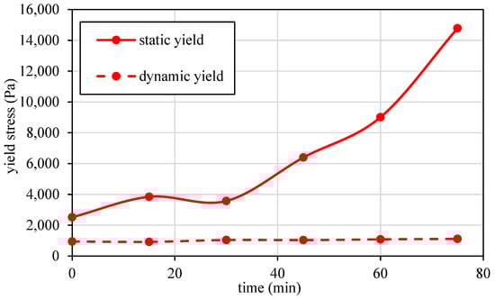 Development of static and dynamic yield stresses of the basic mortar mix designed for 3D printing.