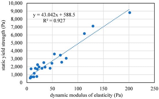 Relation between the dynamic modulus of elasticity and the static yield stress for the mortar mix in Table 1.