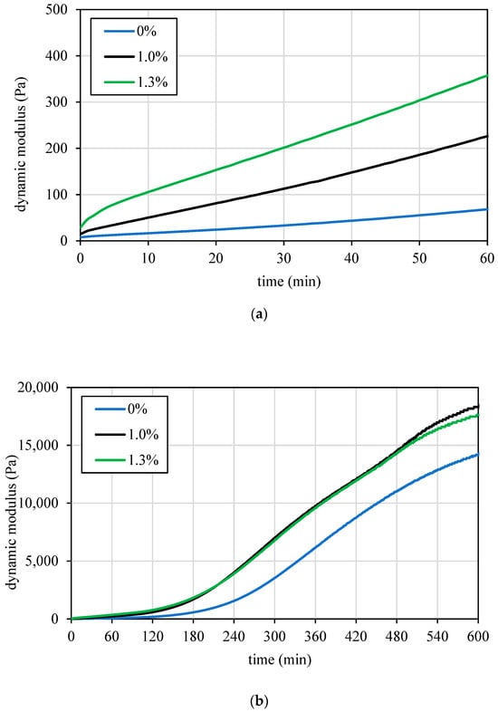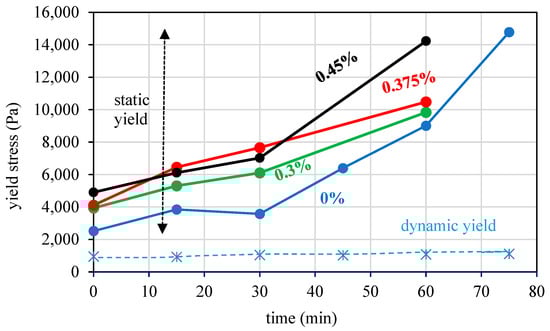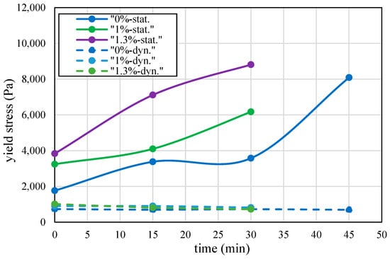 One option is using accelerating admixtures, which are applied in the shotcrete industry to accelerate setting, ensuring immediate adherence of the shot mix to surfaces. For this purpose, varying amounts of accelerating admixture (MasterRoc SA 193, an alkali-free set accelerator for sprayed concrete produced by MasterBuilders) were added to the basic mix, corresponding to 1.0 and 1.3 wt.% of the cement content. Rheological characterization, as seen in Figure 9, shows that admixtures effectively enhanced thixotropic behavior by increasing static yield stress during the first hour while maintaining low and constant dynamic yield stress. This improvement in static yield stress indicates that the mix can achieve better structural stability at an early age, without compromising its workability.