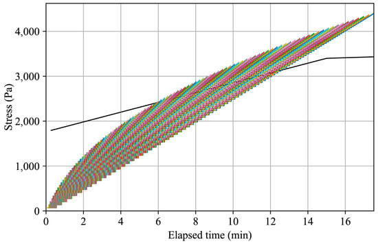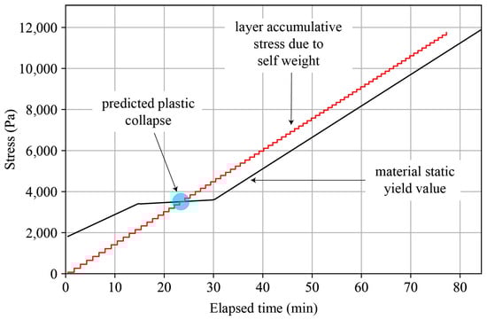Similarly, we account for the self-weight of each layer as it is deposited, which better reflects a real-world scenario where failure might occur at the bottom of any layer, and the weight above the failure point includes the layer itself. Figure 13 describes a schematic representation of such an approach, where the red line represents the shear stress experienced by a given layer and the black line represents the material static yield stress obtained from the rheological test.