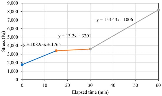 Linear functions fitted to the static yield evolution plots for a basic mortar mixture over the following three distinct time periods: 0 to 15 minutes, 15 to 30 minutes, and 30 minutes forward.