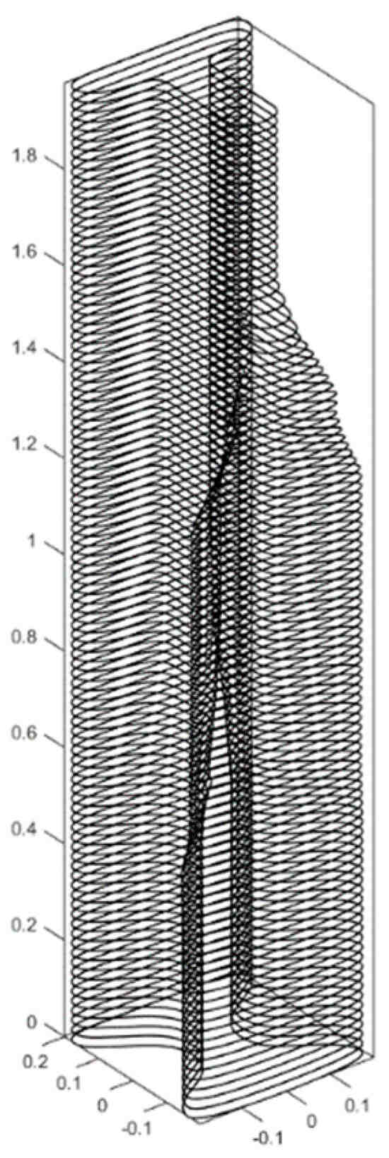 The results of the distance analysis indicate a high level of accuracy between the printed specimens and the computational models. The first printed specimen exhibited an average deviation of + 0.0008 m from the computational model, with most deviations falling between − 0.002 and + 0.005 m. The second printed specimen showed an average deviation of + 0.0005 m, with deviations primarily ranging from − 0.005 to + 0.005 m. Both specimens displayed a pronounced positive deviation in the seam area, visible as a red vertical region, which is more prominent in the second specimen. This anomaly is attributed to the change in direction and height during layer transitions while the printhead continues extruding material. During this brief period, over-extrusion occurs, resulting in excess material deposition. This issue could be mitigated in future prints by designing a tool path that compensates for this phenomenon, possibly by retracting the extruder slightly at the end and beginning of each layer. Alternatively, using a printhead capable of pausing extrusion during layer transitions could prevent this over-extrusion. Additionally, some negative deviations were observed in areas with significant overhang angles. These are second-order effects, and in order to address them, there is a need for additional study considering viscoelastic effects.