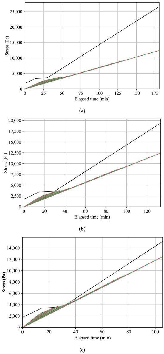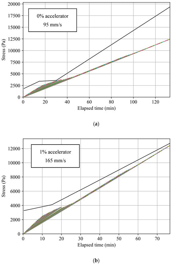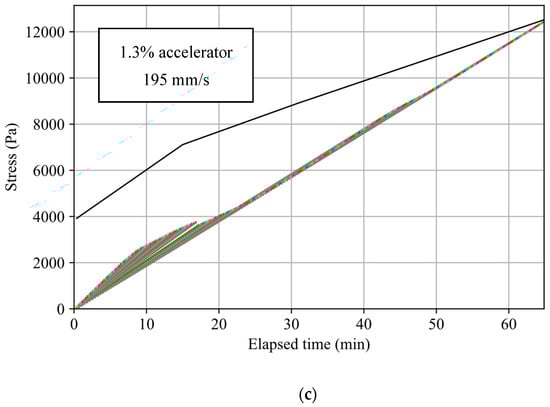 Optimized plots of layer stress buildup based on accelerator-enhanced mixtures’ static yield stress evolution with varying printing velocities ((a) 0% accelerator; (b) 1% accelerator; (c) 1.3% accelerator). The black plot describes the material’s static yield stress as a function of elapsed time. The colorful step plot shows the cumulative stress in each layer, indicating whether the layers are predicted to experience plastic collapse based on the material’s static yield stress.