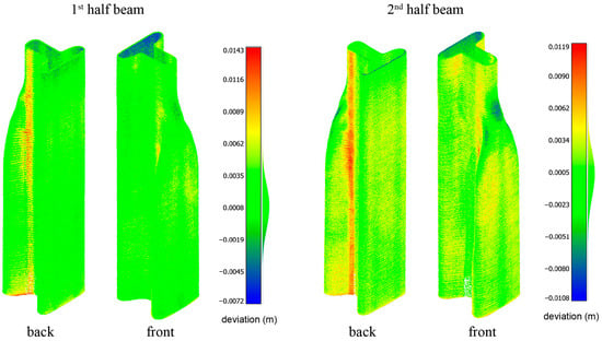 Geometric accuracy evaluation of the printed half-beams. The color maps show the deviation of the scanned half-beams from the computational model. The first half-beam (left) and the second half-beam (right) are displayed from both back and front views. The color scale represents the distance deviation in meters.