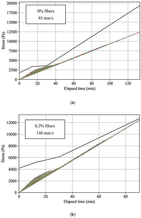 In addition, the mixtures with fibers described in Figure 11 were used to test the effect of the addition of fibers on the printing velocity. The static yield plot was fitted to linear functions, as described in Section 6. The results of the optimized printing velocity for each mixture are illustrated in Figure 27 and Table 7. The results suggest an improvement in printing time with increasing fiber content in the mix.