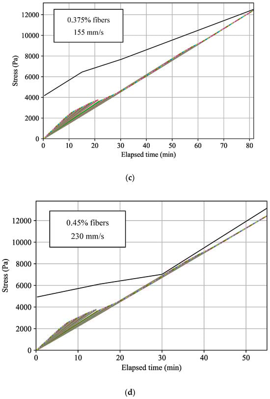 Optimized plots of layer stress buildup based on fiber-enhanced mixtures’ static yield stress evolution with varying printing velocities ((a) 0% fibers; (b) 0.3% fibers; (c) 0.375% fibers; (d) 0.45% fibers). The black plot describes the material’s static yield stress as a function of elapsed time. The colorful step plot shows the cumulative stress in each layer, indicating whether the layers are predicted to experience plastic collapse based on the material’s static yield stress.