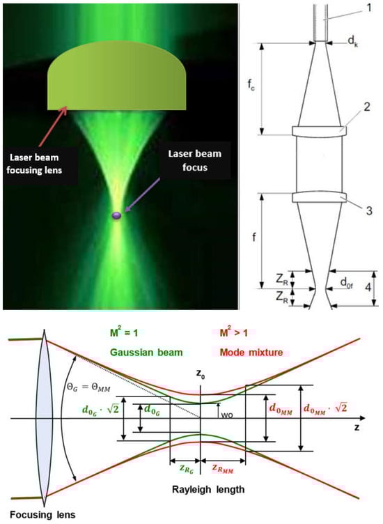 A view of the focused laser beam, TEM00, by the focusing lens over the surface of the welded joint and the schemes of a focused laser beam’s parameters: d00—the ideal focused spot diameter, ΘG—the beam deflection angle in the far field, w0—the radius of the laser beam constriction (diameter of the focus dOG or d0f), 1—the laser beam, 2—the collimator, 3—the focusing lens, 4—the double Rayleigh length (depth-of-focus), dk—the diameter of the optical fiber core, fc—the focal length of the collimator, f—the focal length of the focusing lens, ZR—the Rayleigh length [1,8].