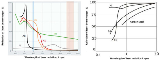 Effect of the wavelength of laser radiation λ—µm, on the reflection of laser beam energy from the surface of metal objects made of steel, Ni, Al, Ag, Au, and Cu [1].