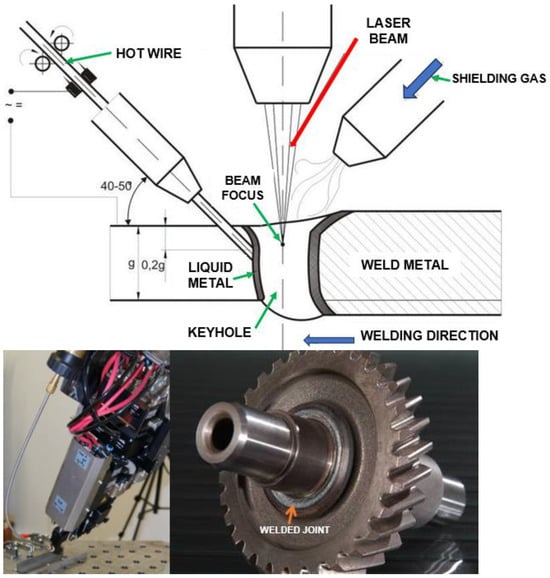 The diagram of the laser beam keyhole mode single pass welding process with hot wire feeding in the weld pool keyhole area. A view of the welding head of the TruDisk 12002 laser during the testing of the cold wire T-joint welding process and a view of the cold wire laser keyhole welded drive shaft gear joint of high-alloy tool steel [1,8].