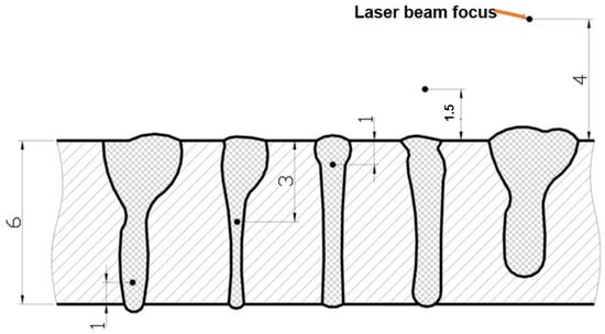 The dimensions of the laser beam focus depend on the quality of the laser beam BPP, which depends on the deviation of the beam in the far field ΘG. This divergence for laser beams of the highest quality, BPP < 5.0 mm × mrad, is usually below a few milliradians. Focusing of the laser beam is performed by high-accuracy optical systems using quartz glass or semiconductor lenses. In the case of laser keyhole welding of butt no-gap joints, as shown in Figure 5, Figure 9 and Figure 14, the laser beam must be focused to a very small possible diameter, to obtain the highest power density. These diameters range from a minimum of 0.003–0.020 mm to 0.5–2.0 mm, in the case of CO2 lasers and fiber and disk lasers. Modern diode lasers provide circular focus spot dia. of 0.2–0.6 mm, as well as square or rectangular focus spots ranging from 0.4 × 0.4 mm to 1.8 × 6.8 mm or up to 8.0 × 8.0 mm, or any customized shapes, as shown in Figure 2 [5,6]. When the diameter or dimensions of the laser beam focus are too small in relation to the gap width of the welded butt joint, it can result in the formation of defects of lack of fusion, lack of penetration, and concavity of the weld face. On the other hand, an excessive diameter of the laser beam focus prevents the formation of a keyhole channel in the welded joint, due to the insufficient power density of the beam and, consequently, the defect of lack of penetration, as shown in Figure 17.