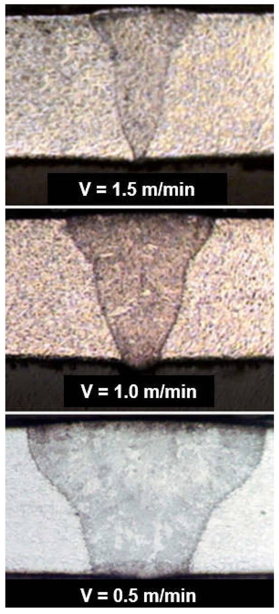 The effect of welding speed—V mm/min, on the shape of the LHW butt joints of API 5LX65 steel pipes, 9.5 mm thick. Fiber laser beam power—7.6 kW, and focus position—2.0 mm, below the top surface of the joint. Welding parameters of the filling pass MAG (DC+) welding: solid wire Nertalic 70S, SAF DUAL 200—diameter 1.6 mm, wire feed speed—6.5–9.0 m/min, wire distance from the laser beam—3.0 mm, shielding gas—Ar + 10% CO2, flow rate—20.0 L/min [1].